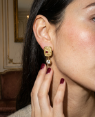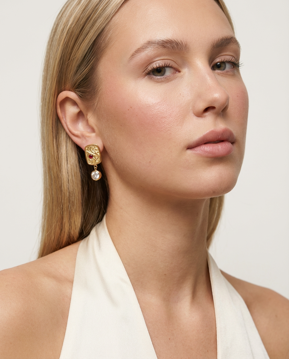 Inspired by antique heirlooms these gold drop earrings feature intricate baroque engraving, a rich ruby-red accent, and a sparkling crystal dangle. Timeless yet bold, perfect for evening wear or adding character to everyday looks.