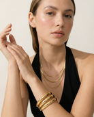 For when you want bold without the bulk. The Élodie Triple Bracelet features three sleek rows of polished gold in one fluid bangle. Clean, structured, and striking. This piece does all the work for you.