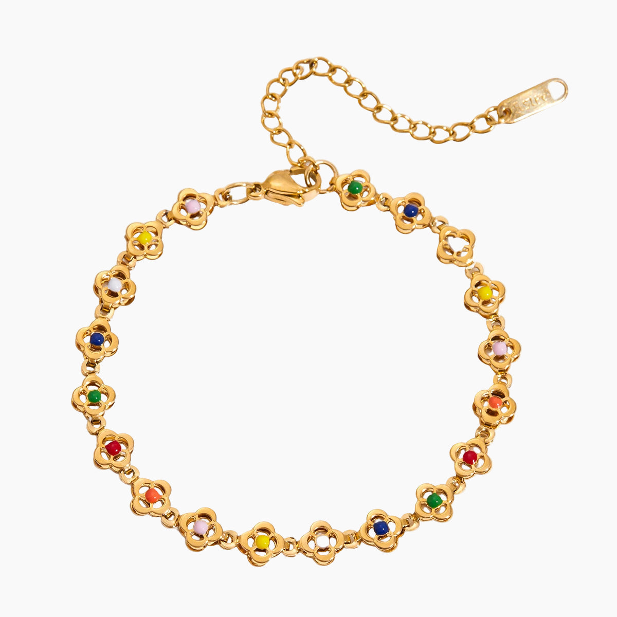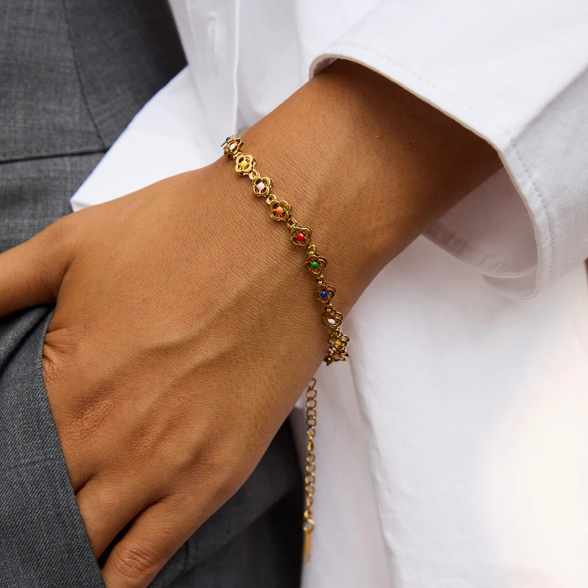 A playful, flower-inspired bracelet that adds a pop of colour to your stack. Featuring multicolour enamel daisies set in gold-toned stainless steel, it’s the perfect everyday piece that’s both charming and bold.