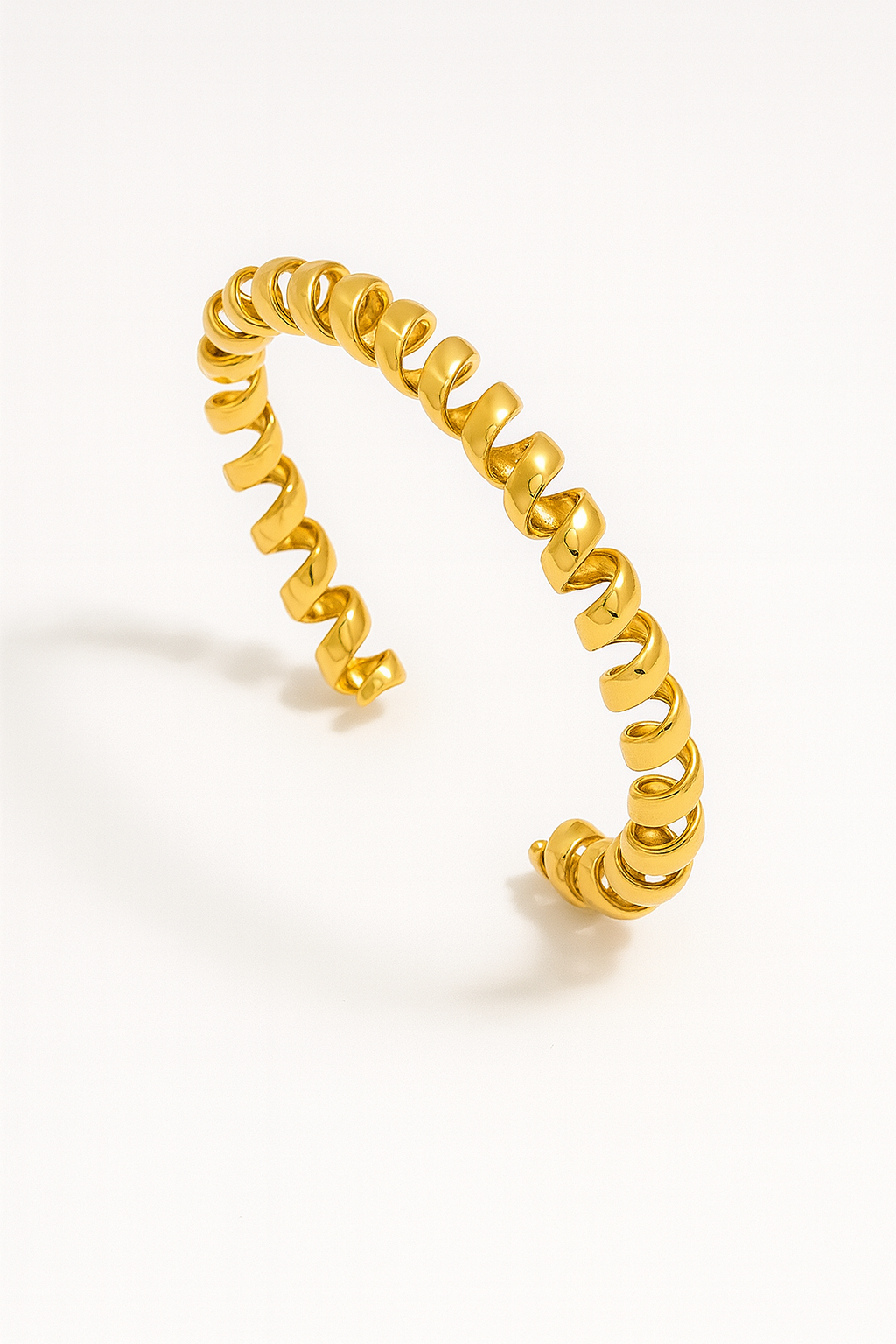 Add a twist. This sculptural spiral cuff makes a bold yet wearable statement. Effortless to slip on, hard to forget. Crafted in waterproof, tarnish-free 18K gold-plated stainless steel. Hypoallergenic and made to last.