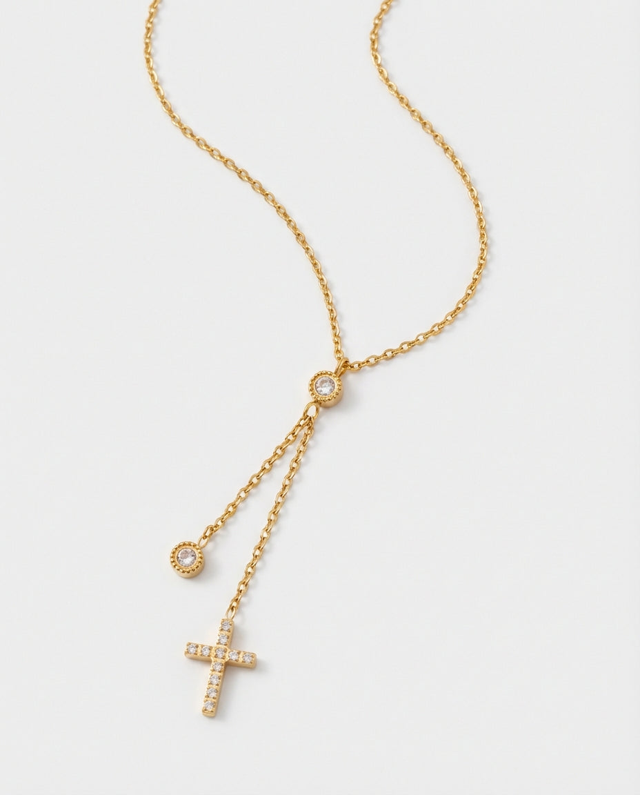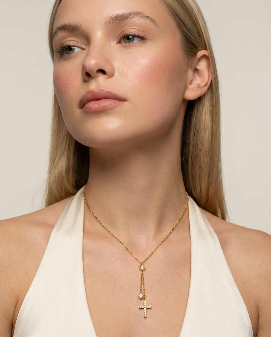 Extended chain cross necklace designed to add refined shine to everyday styling.