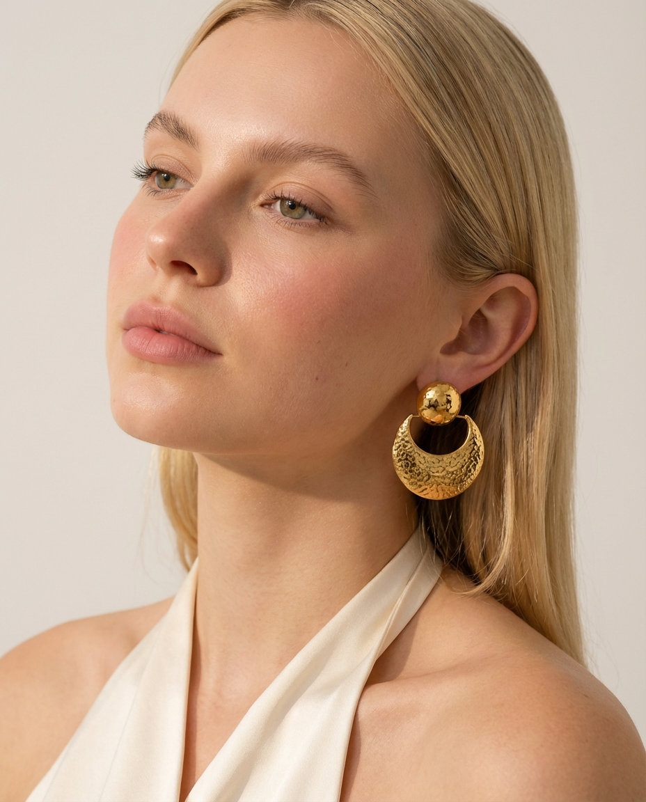 Bold geometric drop earrings with a hammered metal finish for a trendy statement look.