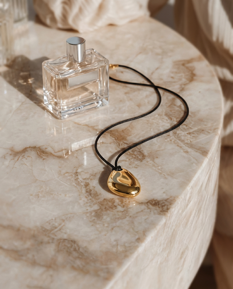 Crafted with a smooth, pebble-shaped pendant available in radiant 18k gold or polished silver finish, this necklace features a sleek black cord for a modern, minimalist look. The waterproof design ensures it's perfect for all-day wear, while the hypoallergenic stainless steel base makes it gentle on sensitive skin.