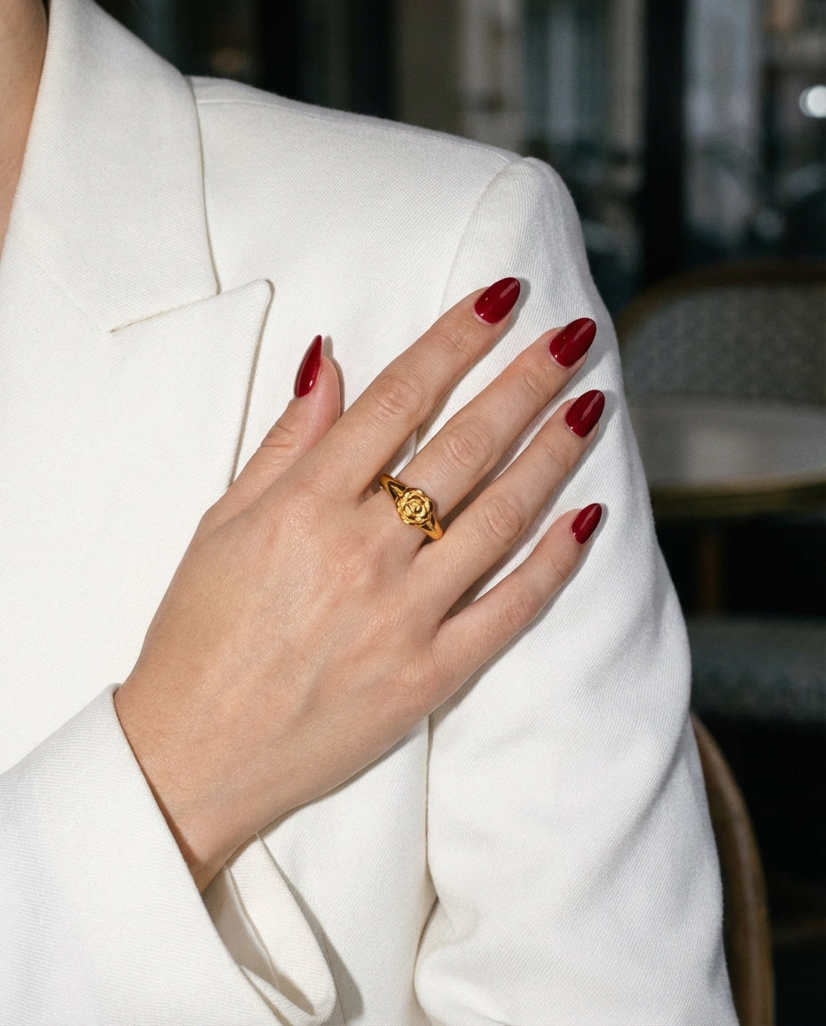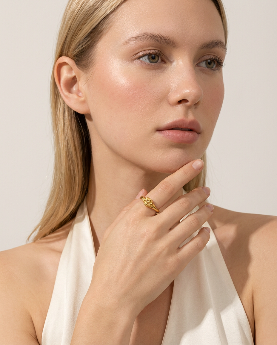 Minimal rose-inspired ring designed to add a soft statement to everyday looks.