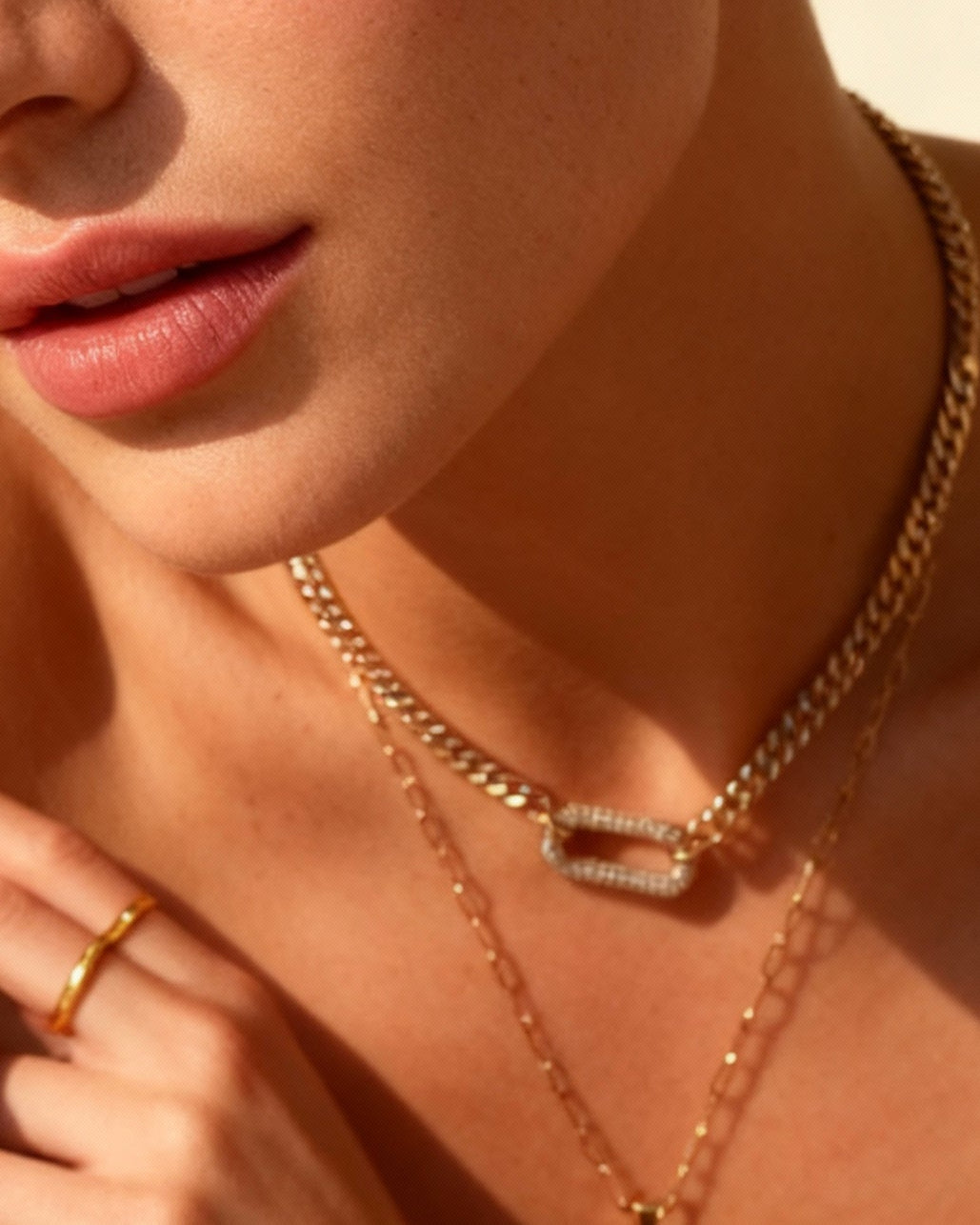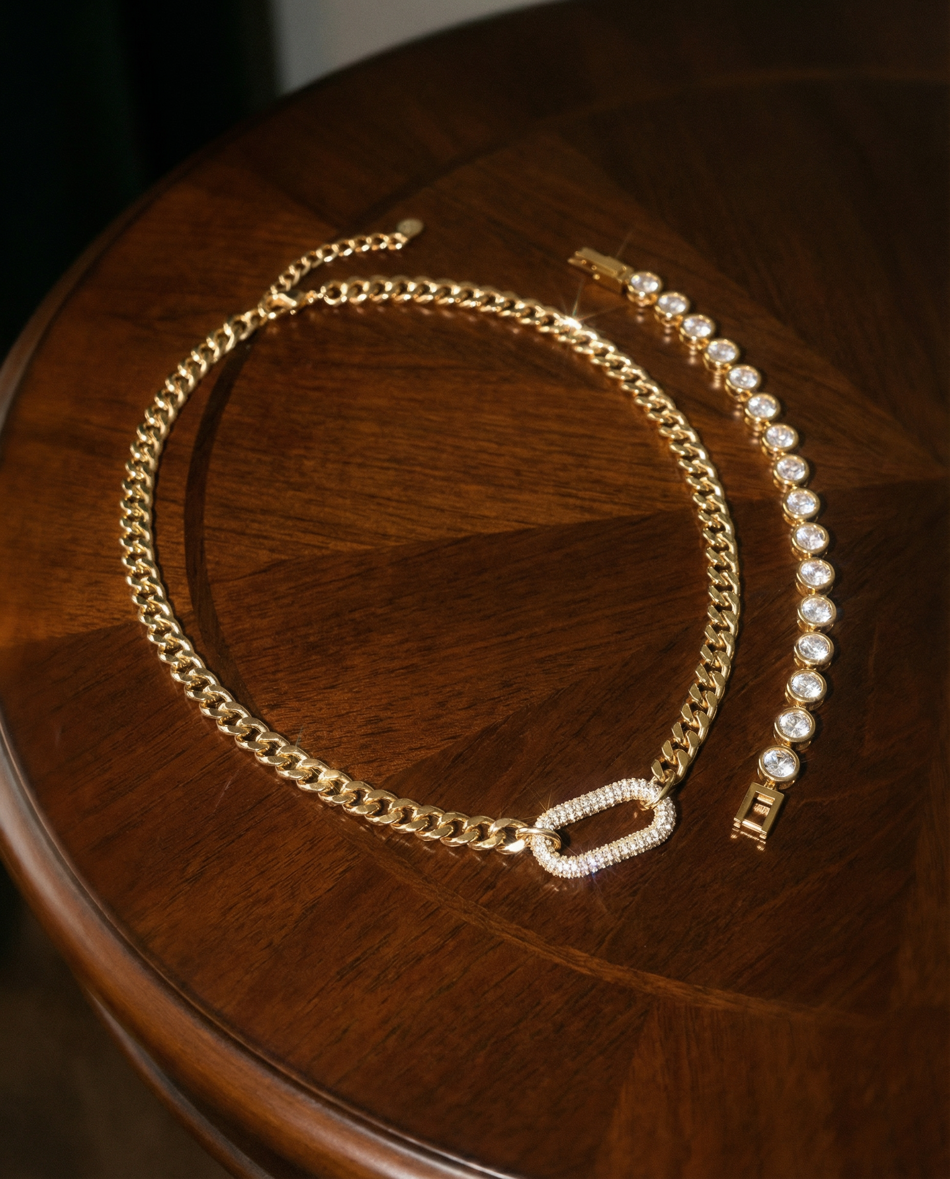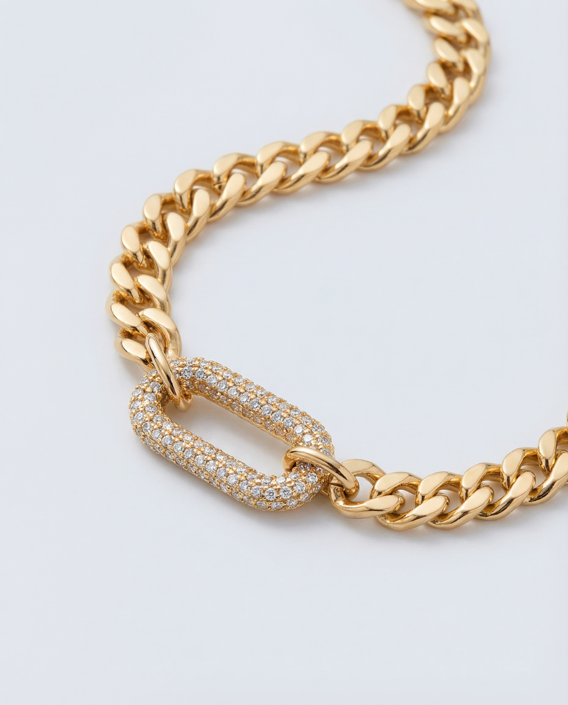 Make a statement with this contemporary necklace featuring a glittering pave link pendant on a chunky curb chain. Crafted from High-Quality Stainless Steel and plated in rich 18k Yellow Gold, this piece offers luxury without compromise. The pendant sparkles with ethically sourced AAAAA Diamond Simulants for maximum brilliance.