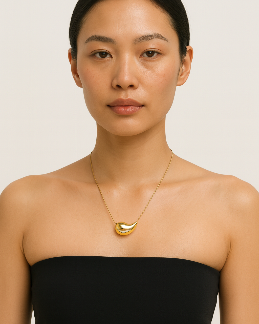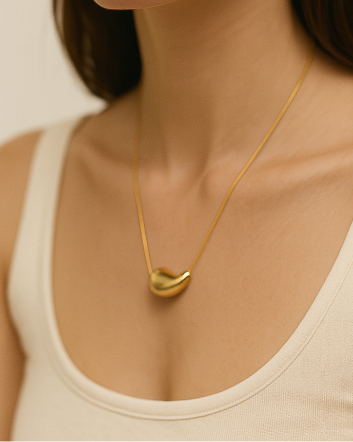 Make a soft yet striking statement with the Élodie Necklace, designed with an elegant fluid teardrop pendant suspended on a fine gold chain. Crafted from stainless steel-plated 18k gold, this piece is waterproof, heat-resistant, and hypoallergenic—made for everyday sophistication. Its sculptural silhouette catches the light beautifully, making it the perfect minimalist showpiece.
