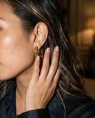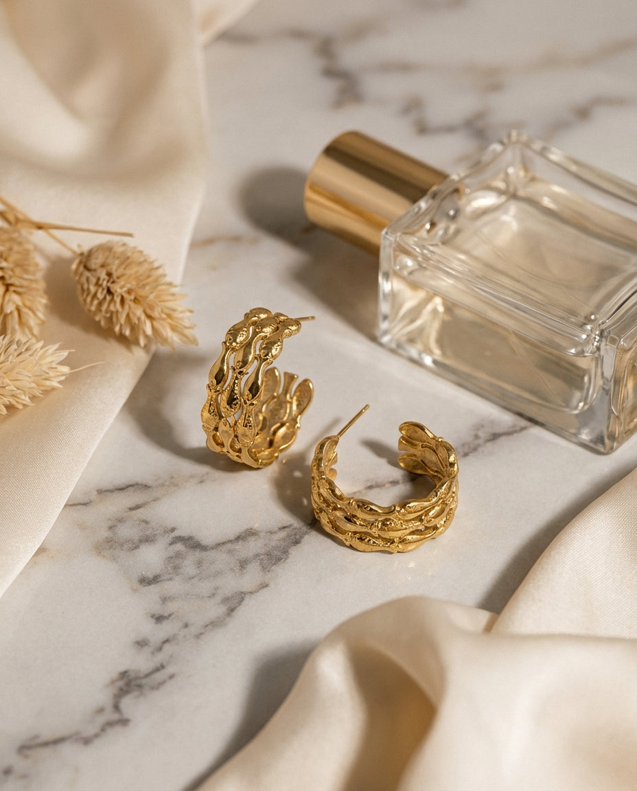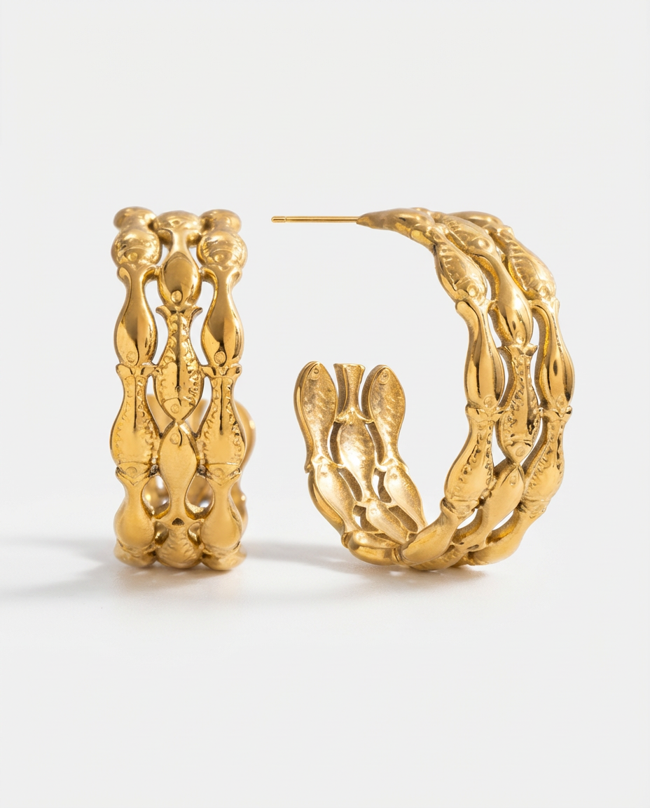 The Kai Hoop Earrings feature a sculptural C-shaped silhouette inspired by fluid ocean forms, creating a subtle statement piece that complements everyday styling.