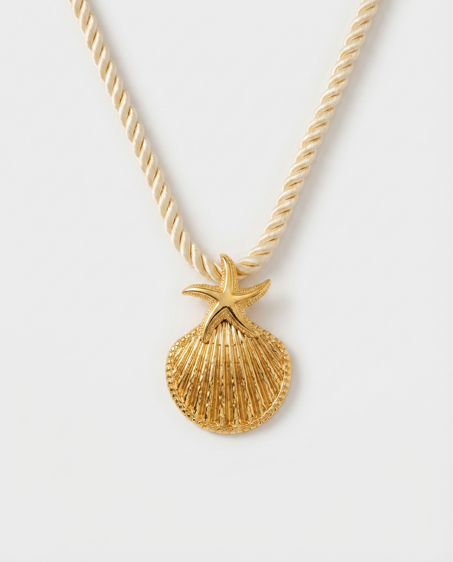 Your summer neck game just got an upgrade. This oversized 18K goldplated shell pendant sits on a chunky ivory rope chain for a look that's bold, beachy, and completely yours. The starfish detail on top makes it a proper statement piece without trying too hard.