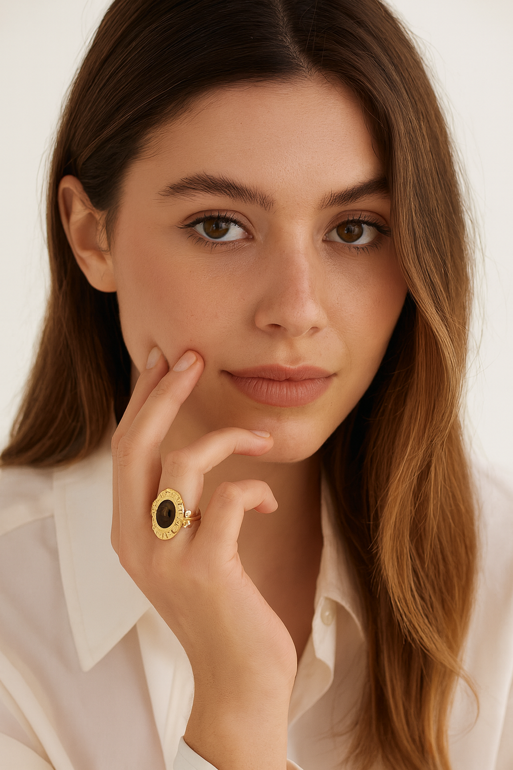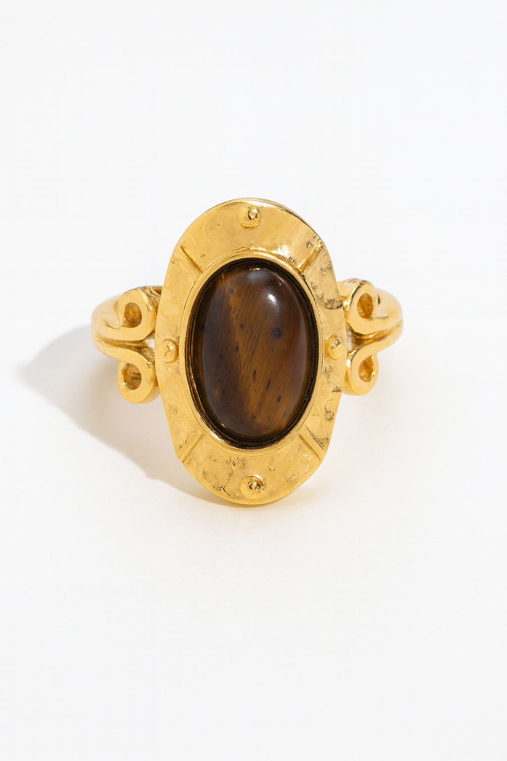 A vintage-inspired piece with bold energy. Featuring a rich tiger’s eye stone in a hammered gold setting with intricate side detail. This is your power ring.