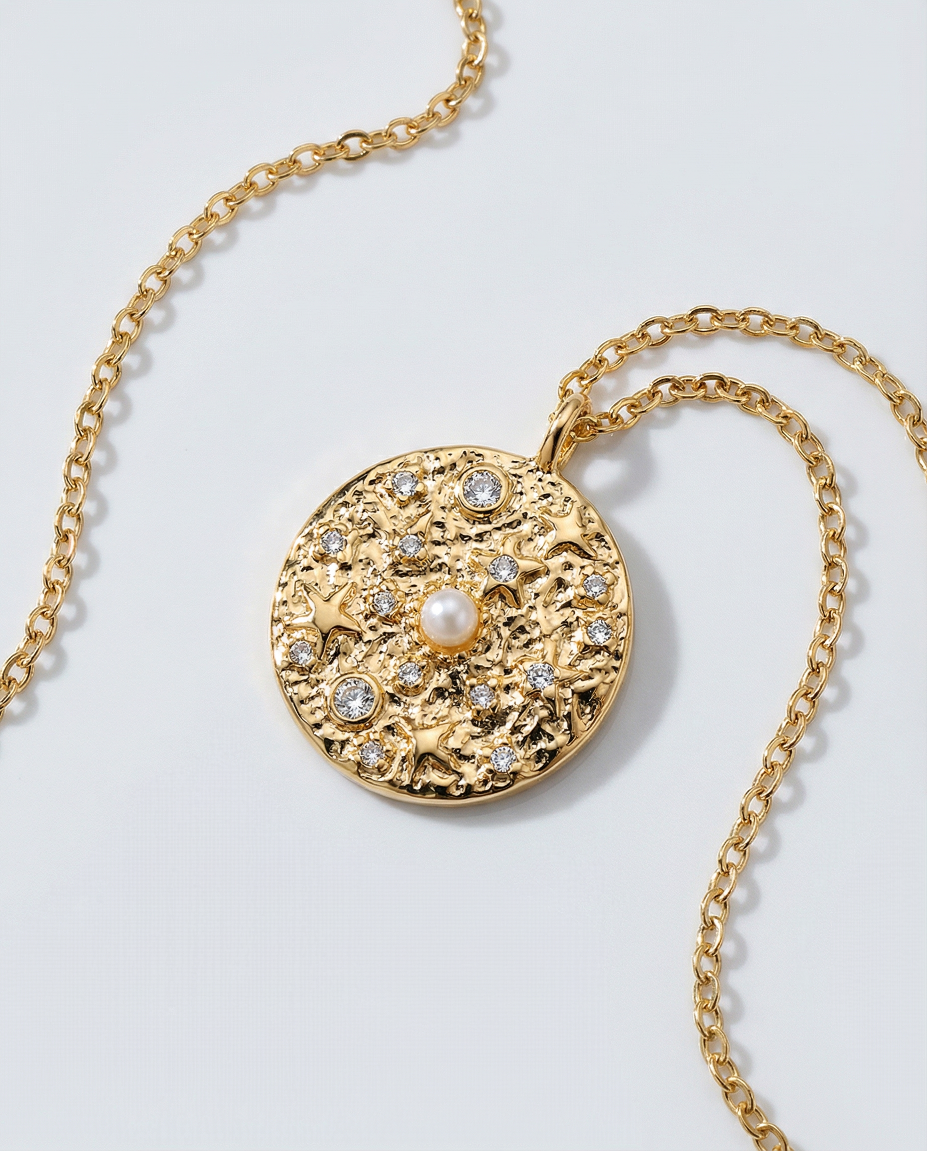 Channel celestial energy with the Celeste Necklace, a textured gold medallion adorned with glimmering stones and a central pearl that mirrors the night sky. Whether layered or worn solo, it adds a radiant, starry charm to any outfit.