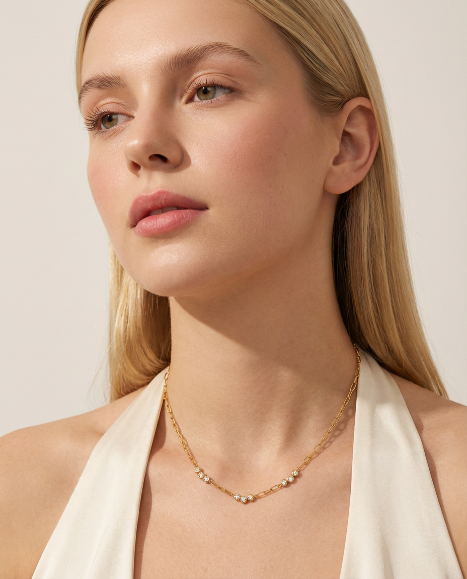 A classic minimalist paperclip choker necklace featuring a round white zircon accent for a refined and modern look.