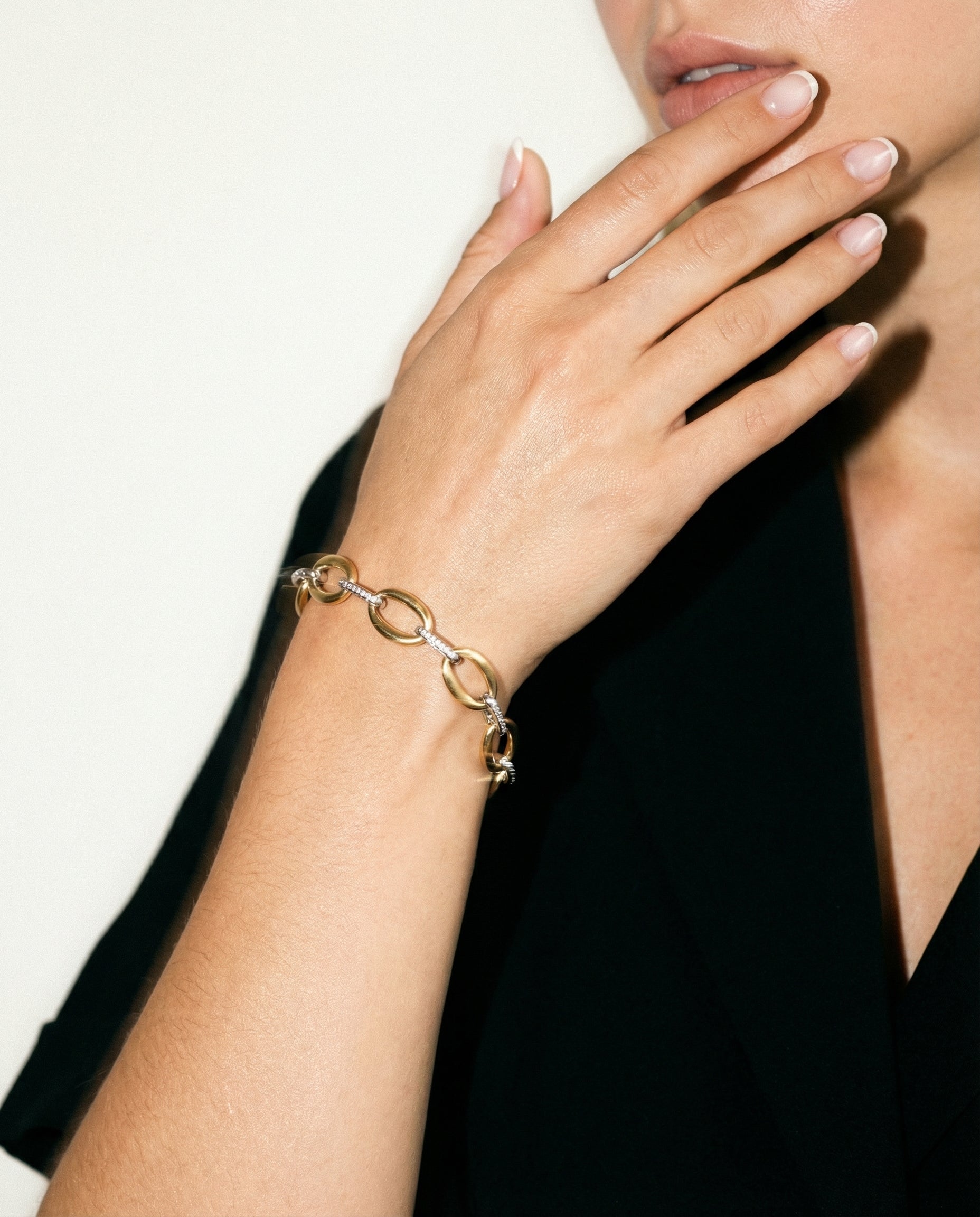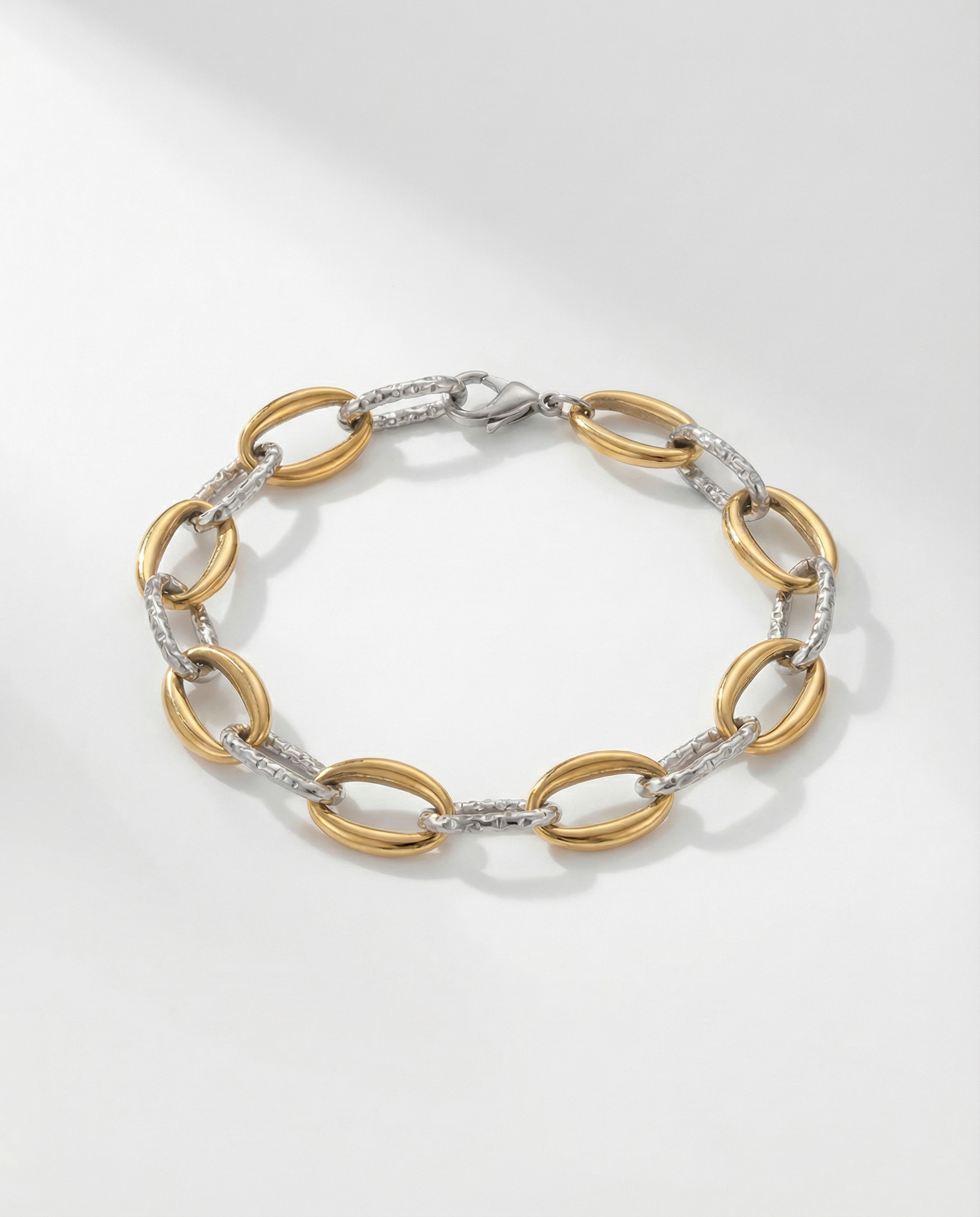 A minimalist two-tone chain bangle crafted in stainless steel, designed for a modern unisex look in gold and silver matching tones.