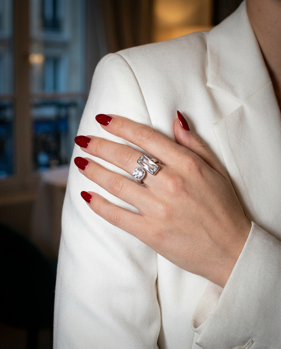A modern geometric design with subtle crystal detailing for effortless elegance.