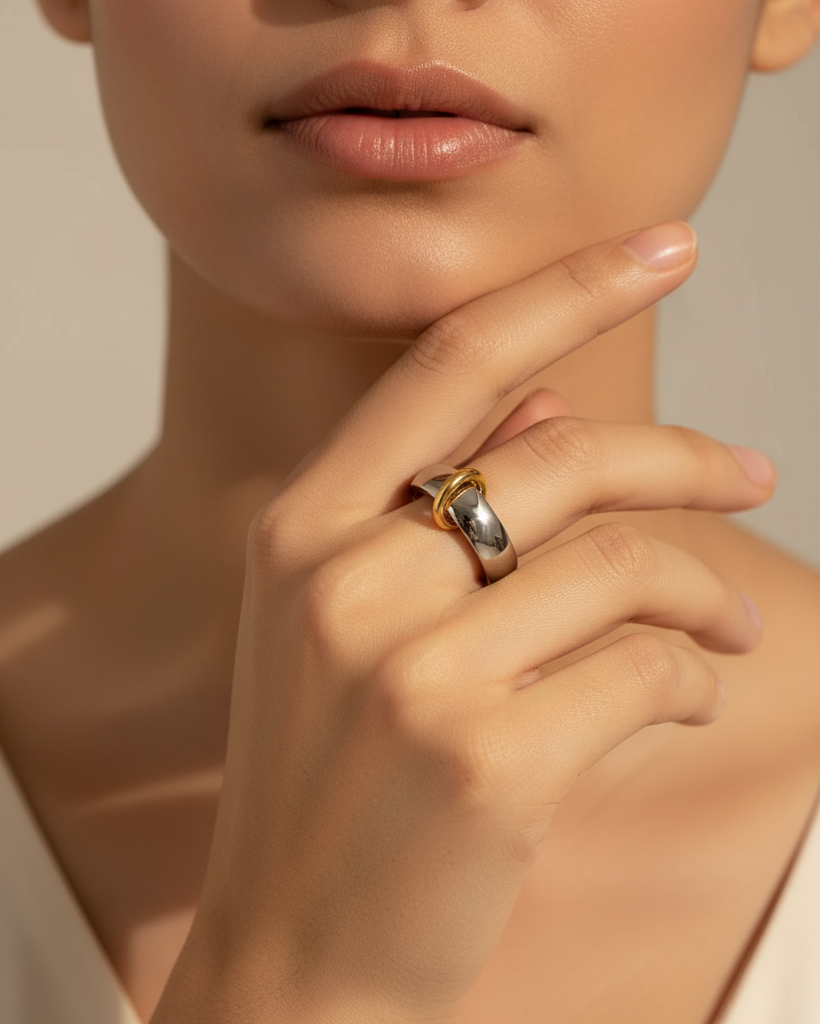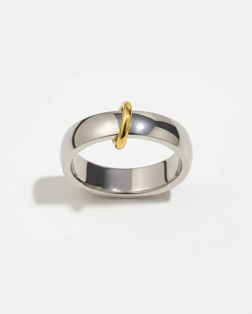 Minimalism meets bold contrast in the Émile Dual-Tone Ring. A sculptural blend of polished silver and 18K gold tones, joined by a statement knot accent. With its clean lines and chunky silhouette, this ring is a sleek modern essential that elevates your everyday stack.