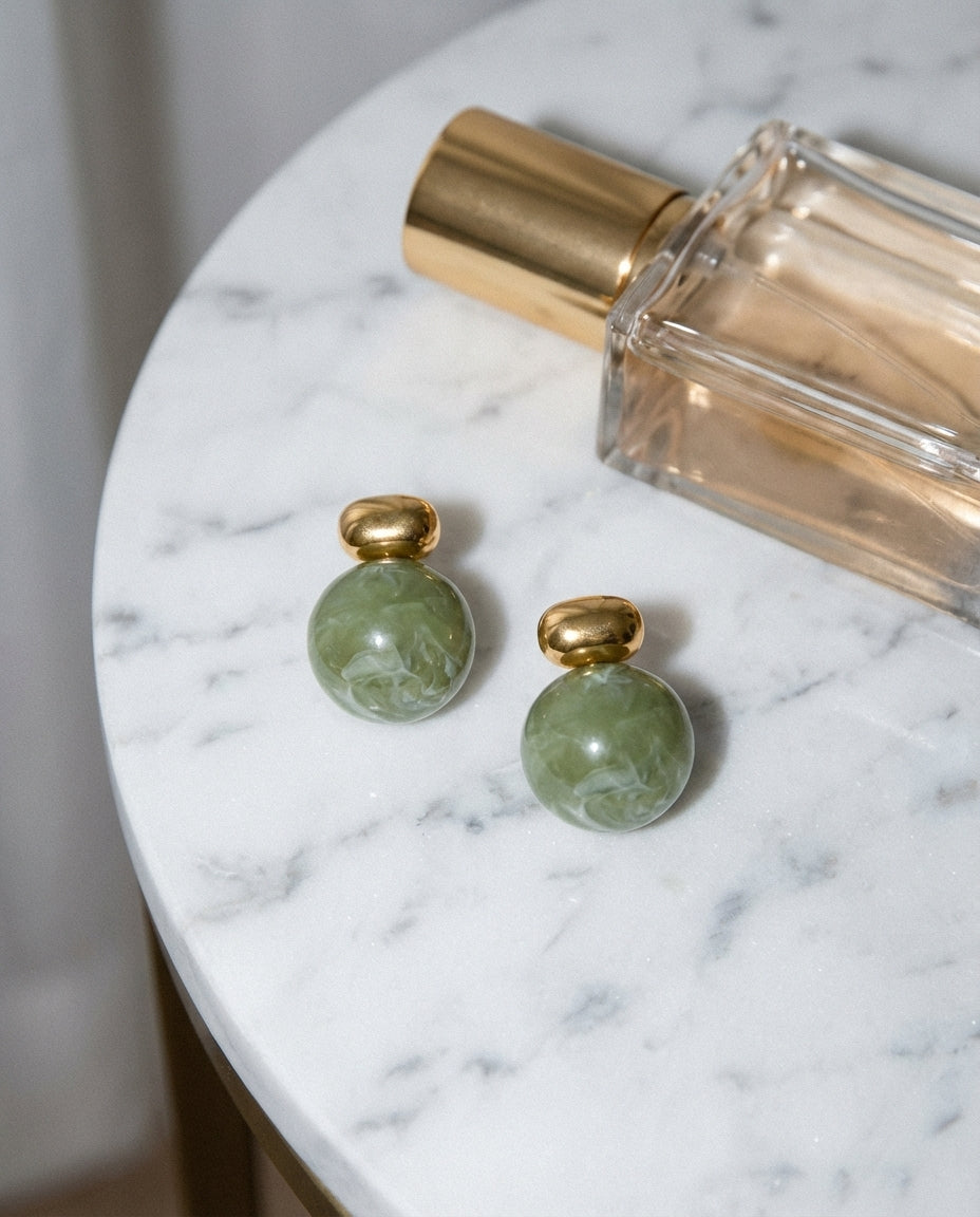 The Resin Stud Earrings feature a refined geometric silhouette with a deep green resin accent, creating a subtle statement piece for effortless everyday styling.