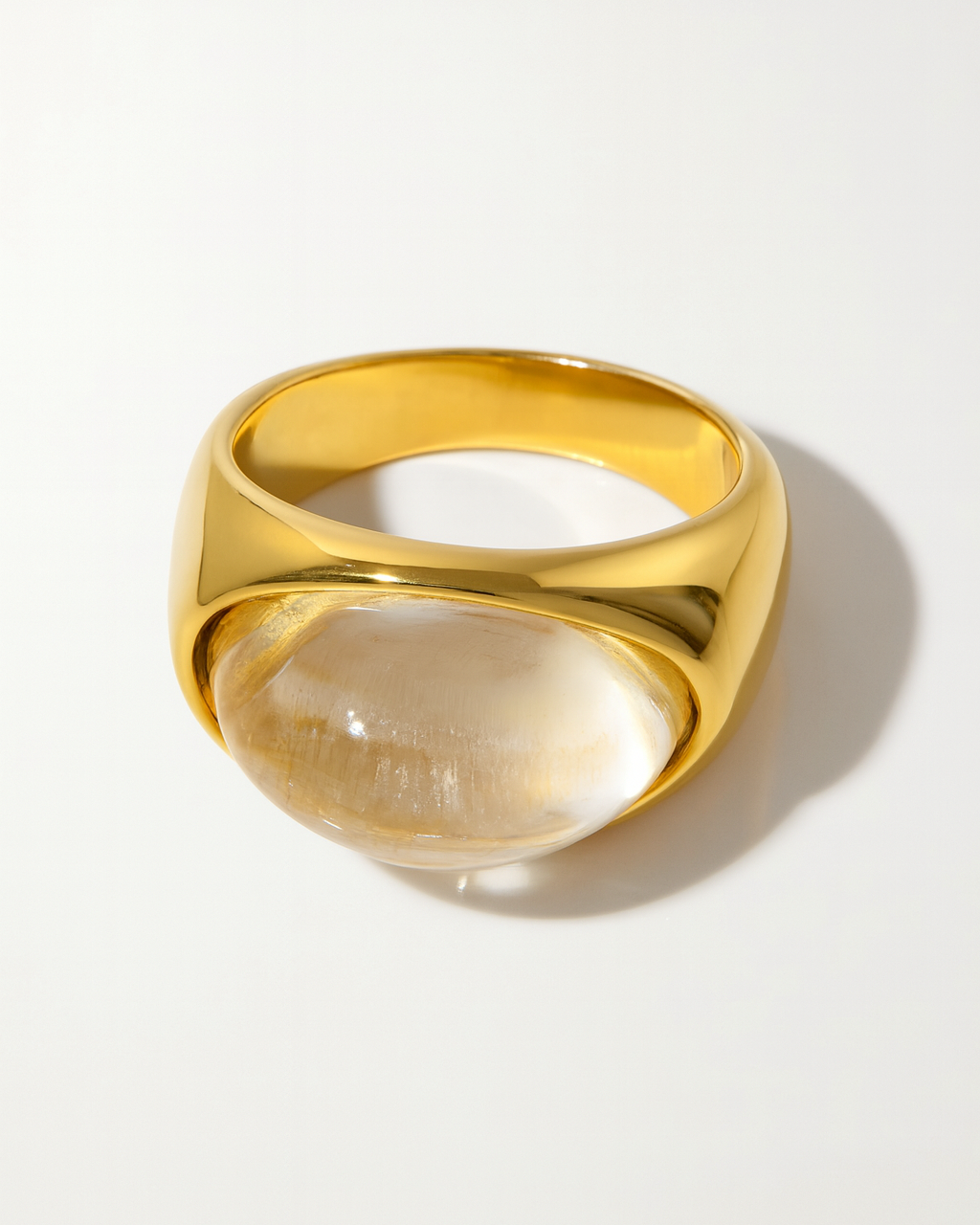 Bold yet ethereal. This dome ring features a luminous clear quartz-style center, cradled in a sleek gold band. It catches the light from every angle, making it the perfect statement piece for everyday magic.