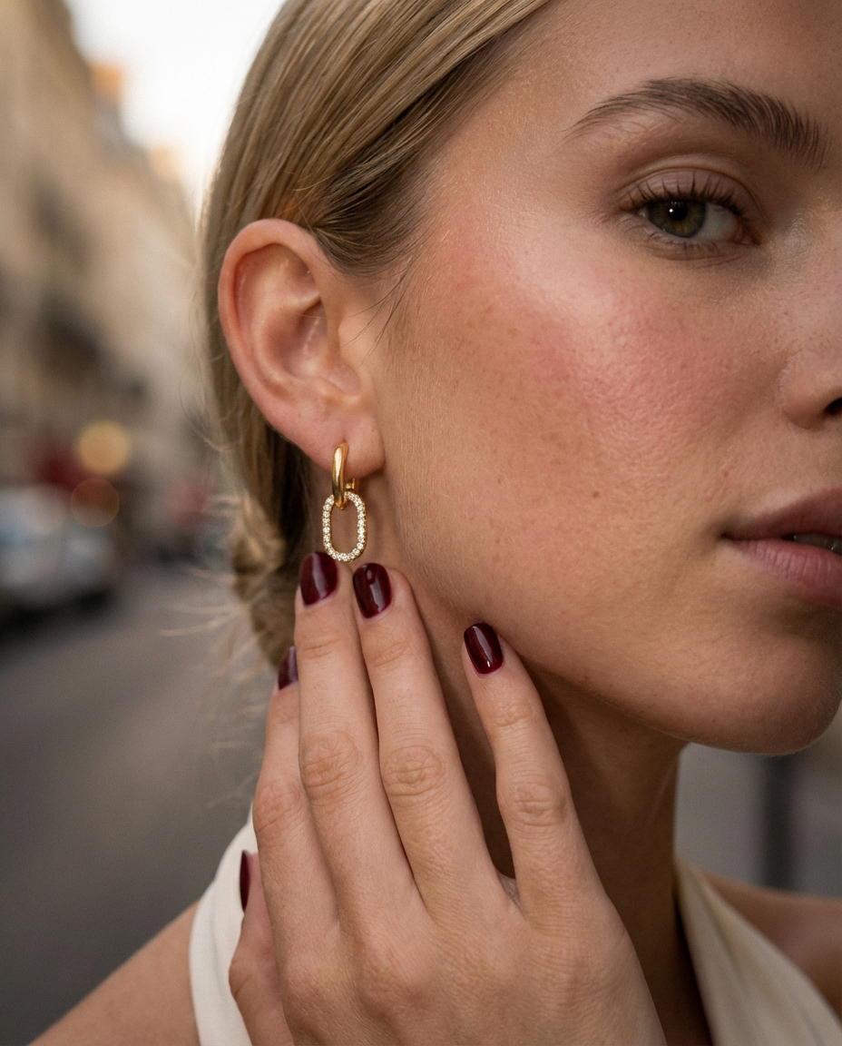 Double the sparkle, double the impact. The Luna Double Hoop Earrings bring that effortless glamour with two delicate hoops adorned with premium diamond-look stones that catch the light from every angle.