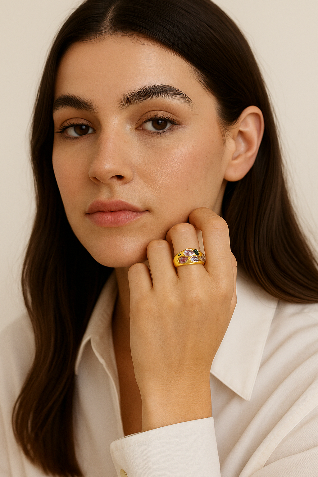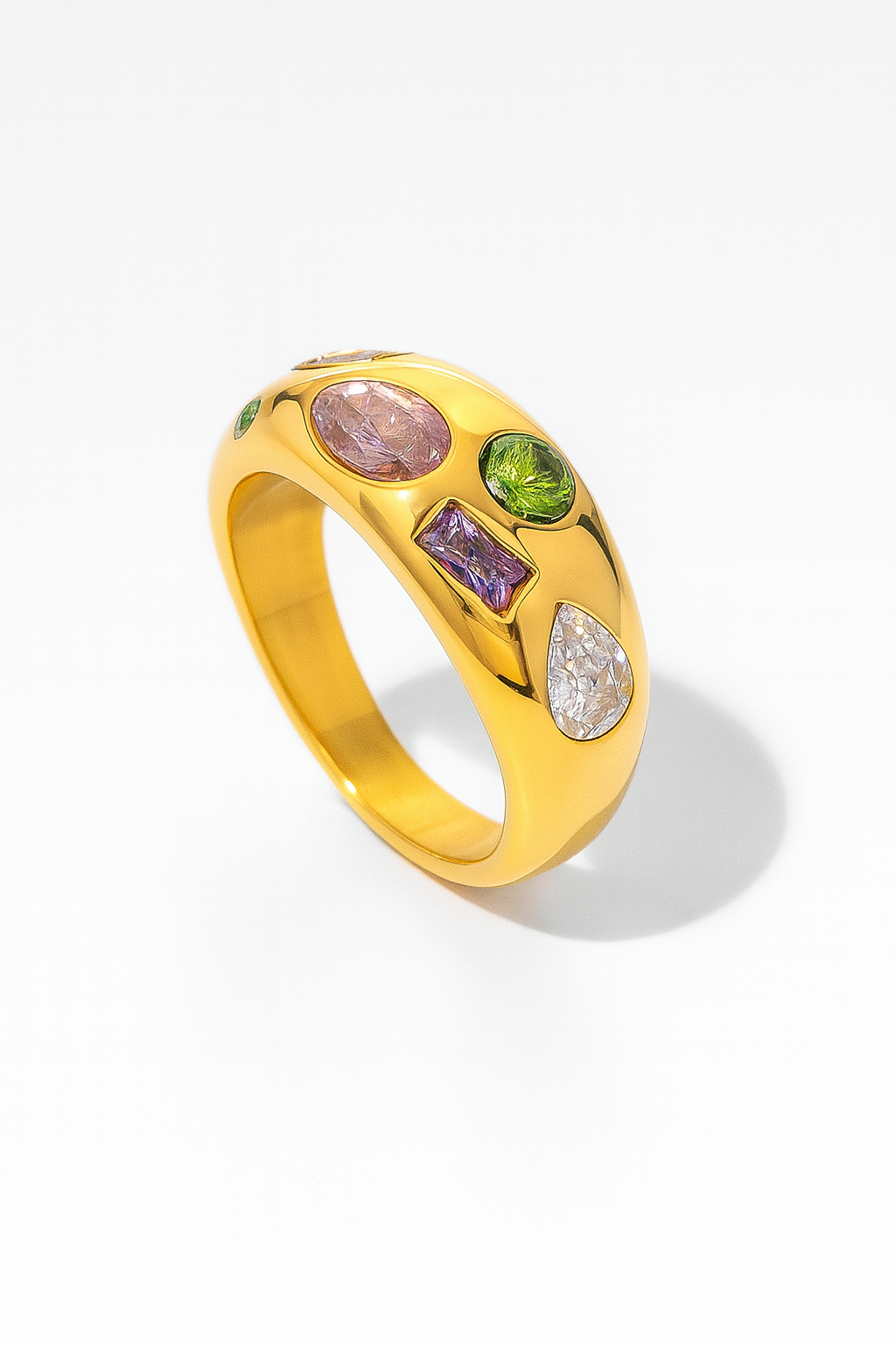 Colourful, chunky, and bold. This sculptural dome ring features a playful mix of pastel and jewel-toned stones set in shiny 18K gold-plated stainless steel. It’s waterproof, hypoallergenic, and designed to stack or shine solo.