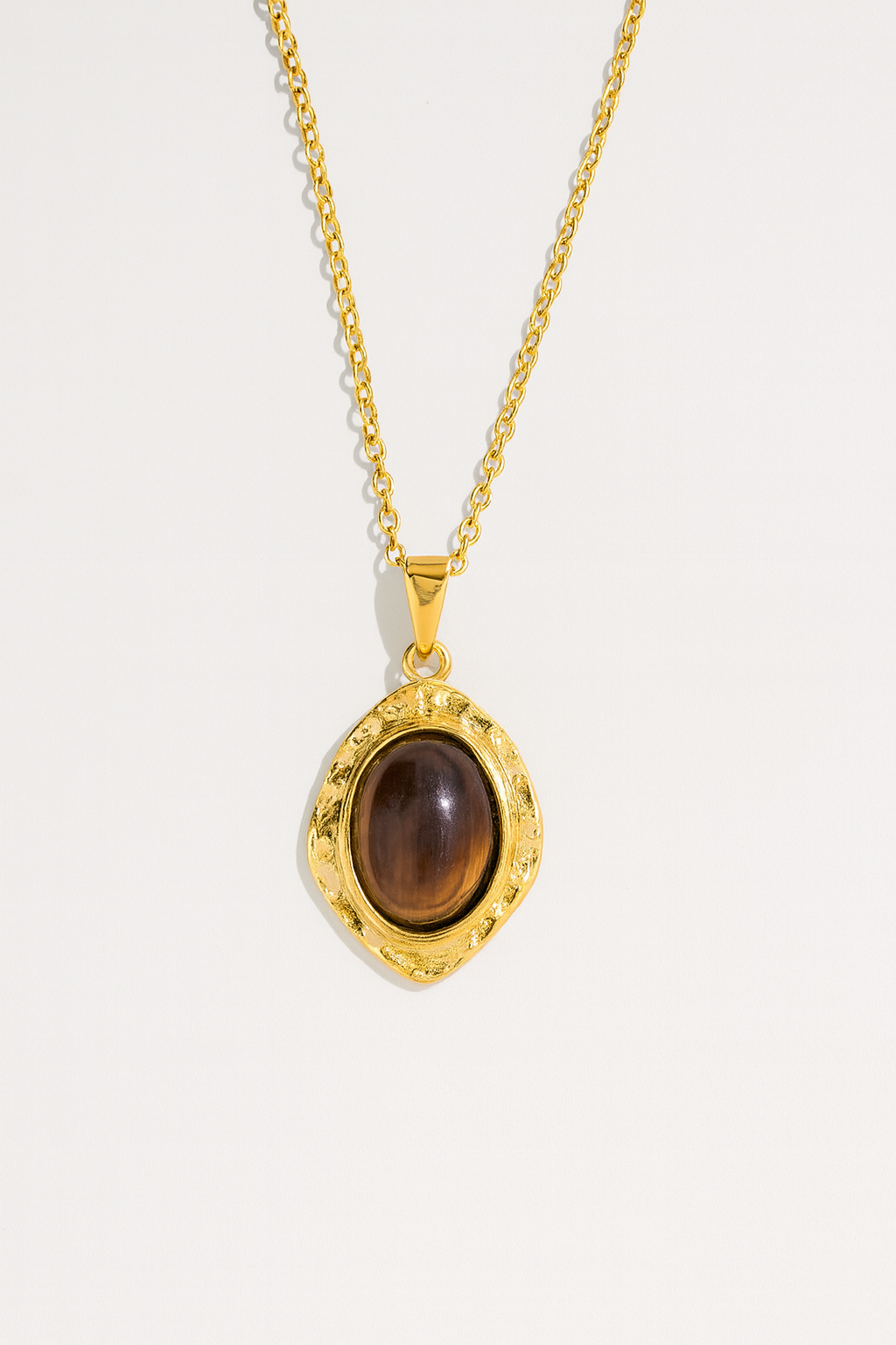 Grounded yet elegant, this vintage-inspired necklace features a natural tiger eye stone framed in a textured gold bezel. Designed for layering or wearing solo with intention.