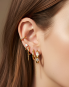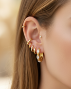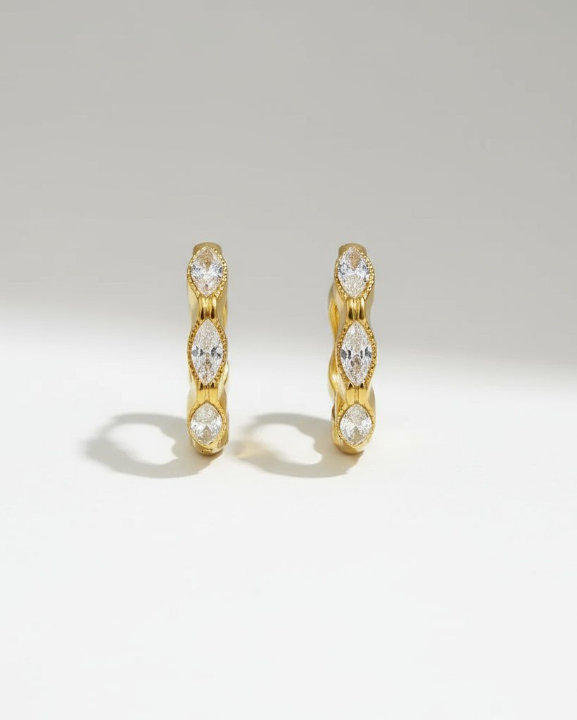 Delicate yet dazzling, the Marquise Wave Huggies are crafted to catch the light from every angle. Featuring marquise-cut stones in a sculptural wave setting, these 18K gold-plated huggies offer a luxe, eye-catching twist on everyday minimalism.