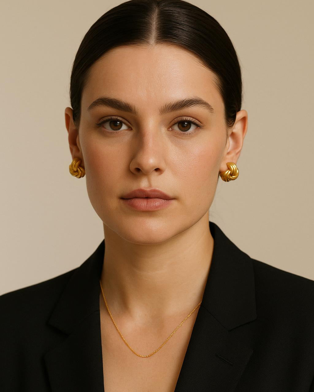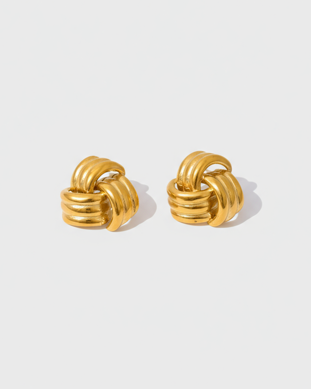 Crafted in high-polish 18K PVD gold plating over durable stainless steel, these hoops feature an intricate knotted design that symbolizes connection and strength. Lightweight yet bold, they pair effortlessly with sleek buns, soft waves, or an off-shoulder neckline.