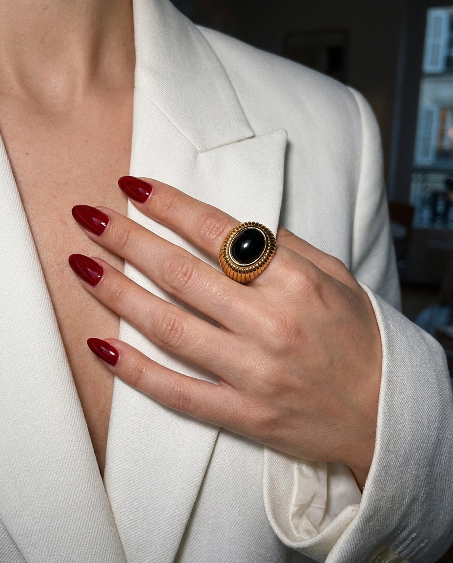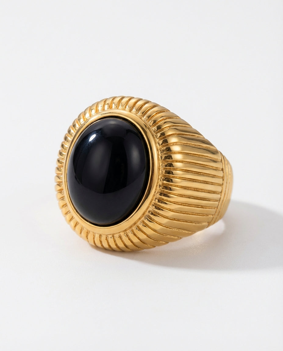 A vintage-inspired oval ring featuring bold black agate striping for a statement finish.