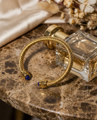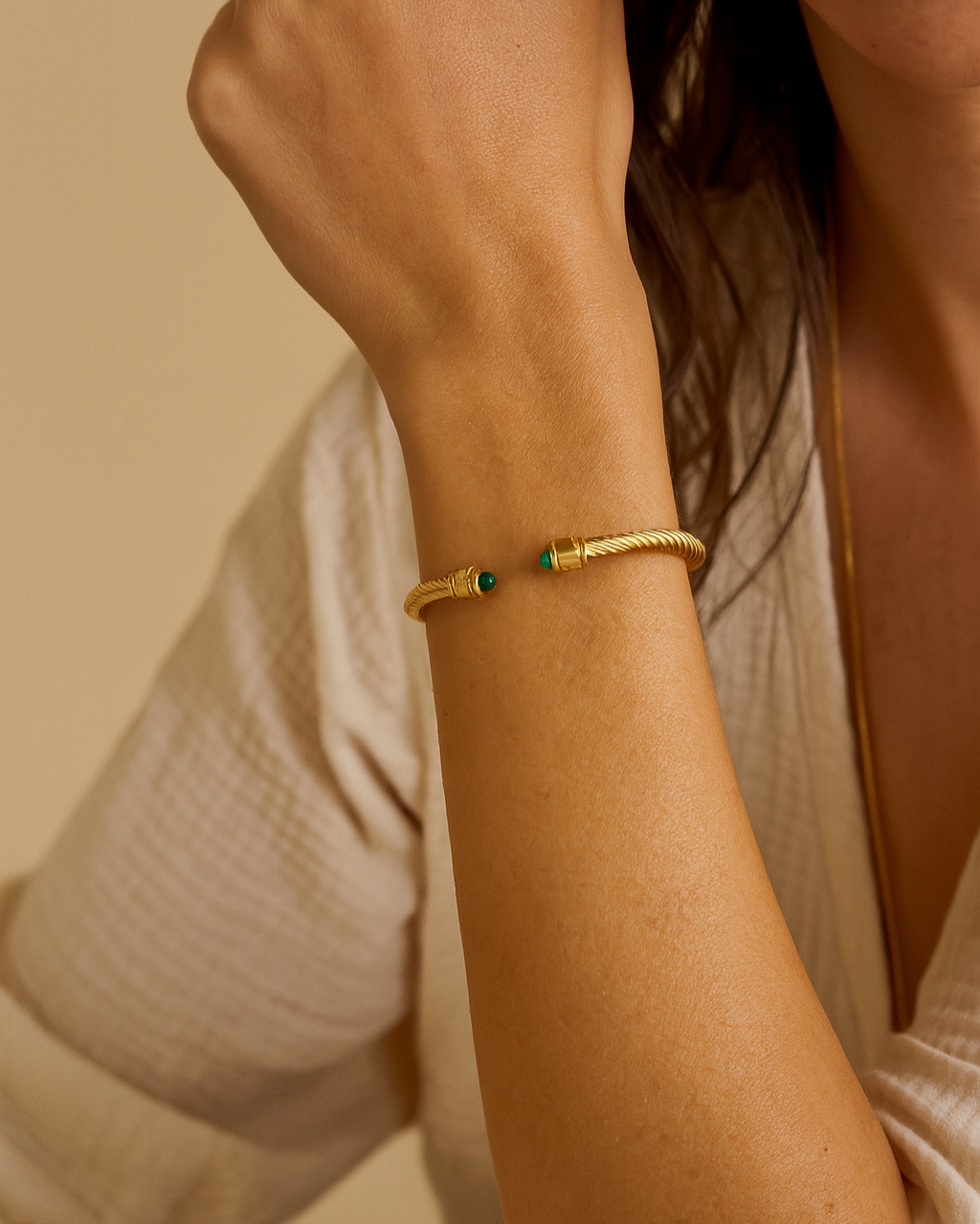 The Solène Bangle blends vintage charm and modern elegance in a twisted rope silhouette finished with vibrant gemstone accents. Crafted from stainless steel-plated 18k gold, this open cuff is hypoallergenic, waterproof, and designed to elevate your everyday stack. Whether styled solo or layered, it’s a timeless piece made to stand out.