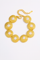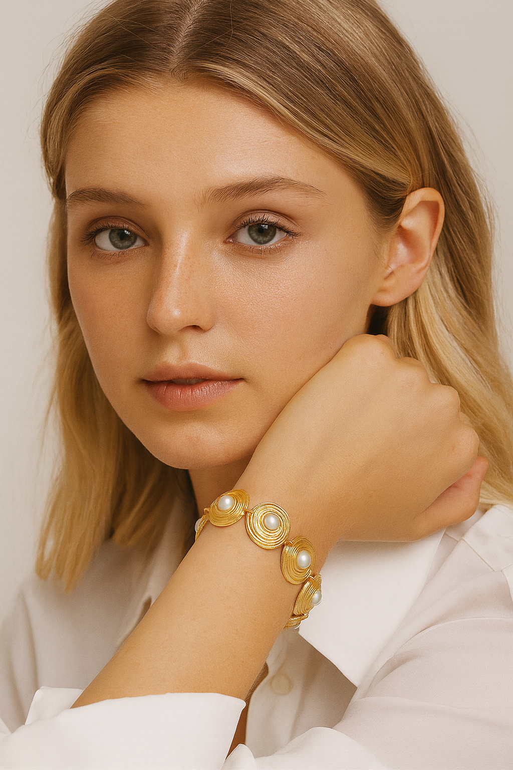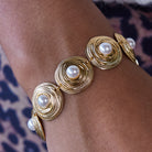 Vintage glamour meets modern elegance. Featuring sculpted golden medallions with luminous faux pearls, this piece instantly elevates your wrist stack.