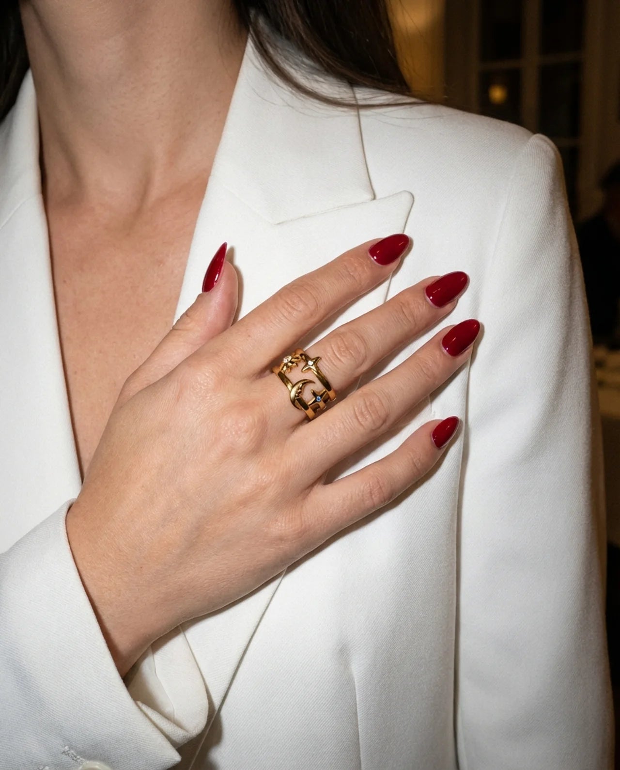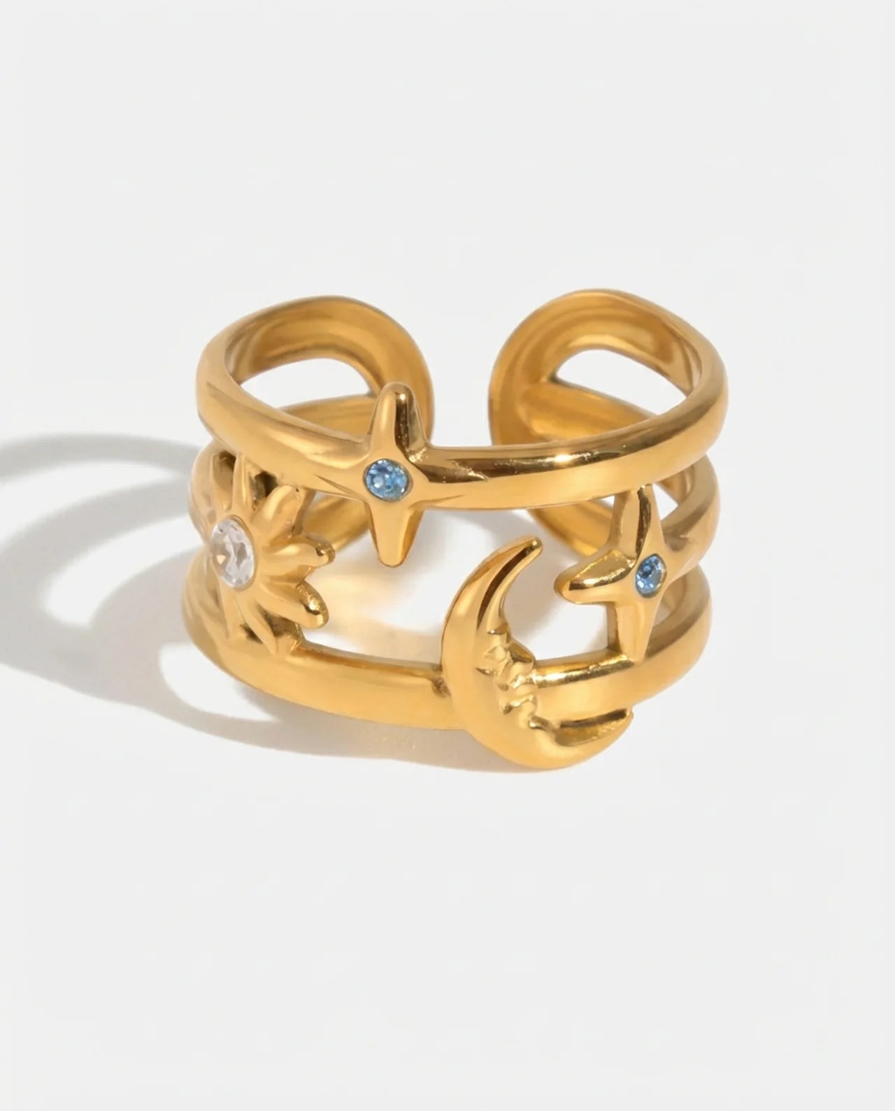 Sun, moon, and star on one open-set ring. The Soleil is the ring you stack everything else around or wear solo when nothing else is needed. Waterproof, tarnish-free, lifetime colour warranty.