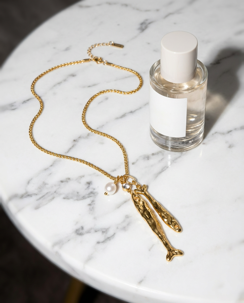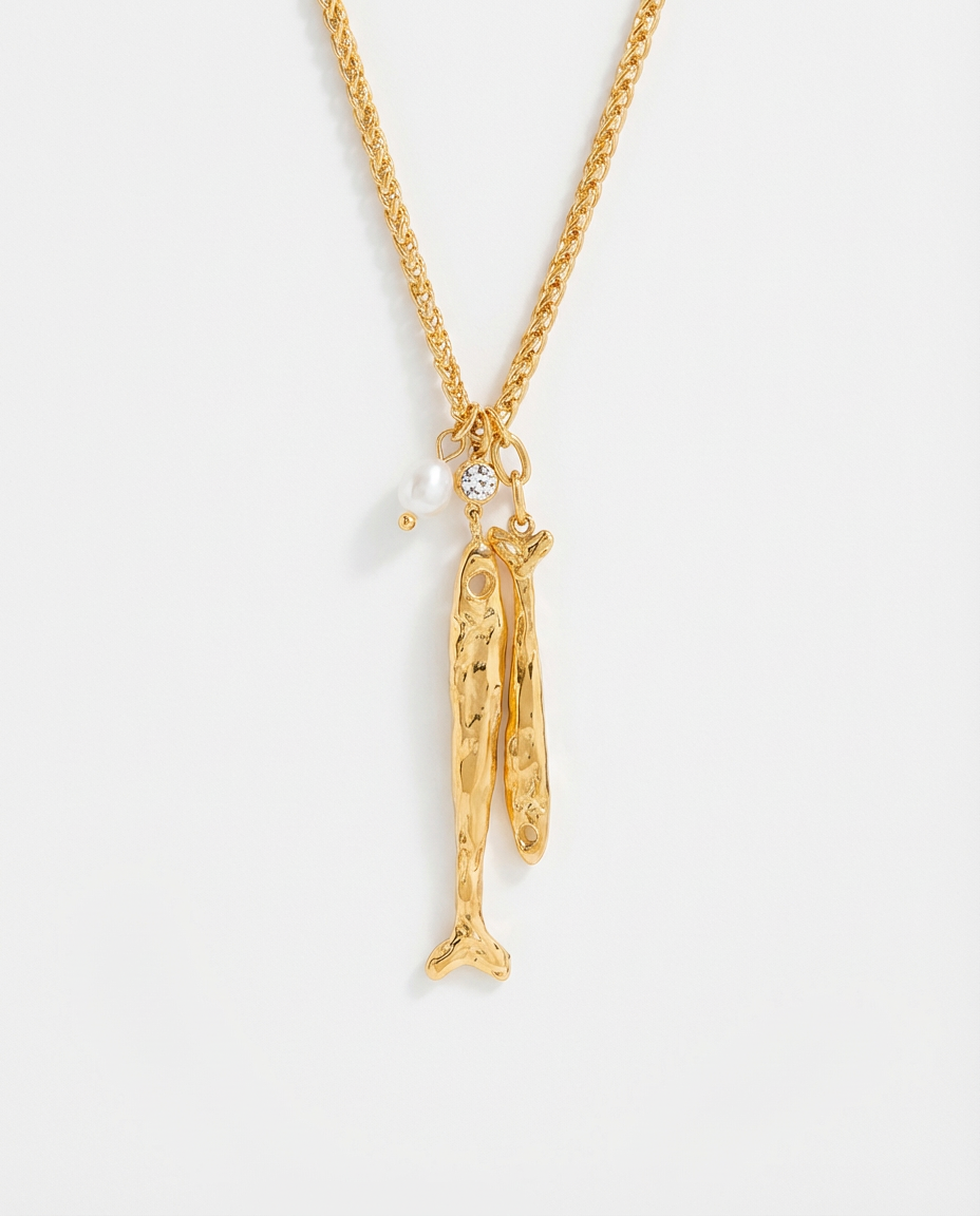 The Pearl Fish Pendant necklace combines a delicate freshwater pearl with a sculptural fish charm, creating a refined statement piece that elevates everyday styling.
