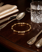 Sculptural and sleek. The Mila Bangle reimagines bamboo in glossy gold with pavé crystal accents. Elegant on its own, striking stacked. A modern classic with quiet luxury energy.