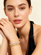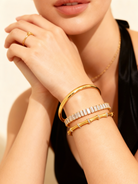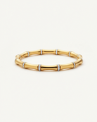 Sculptural and sleek. The Mila Bangle reimagines bamboo in glossy gold with pavé crystal accents. Elegant on its own, striking stacked. A modern classic with quiet luxury energy.