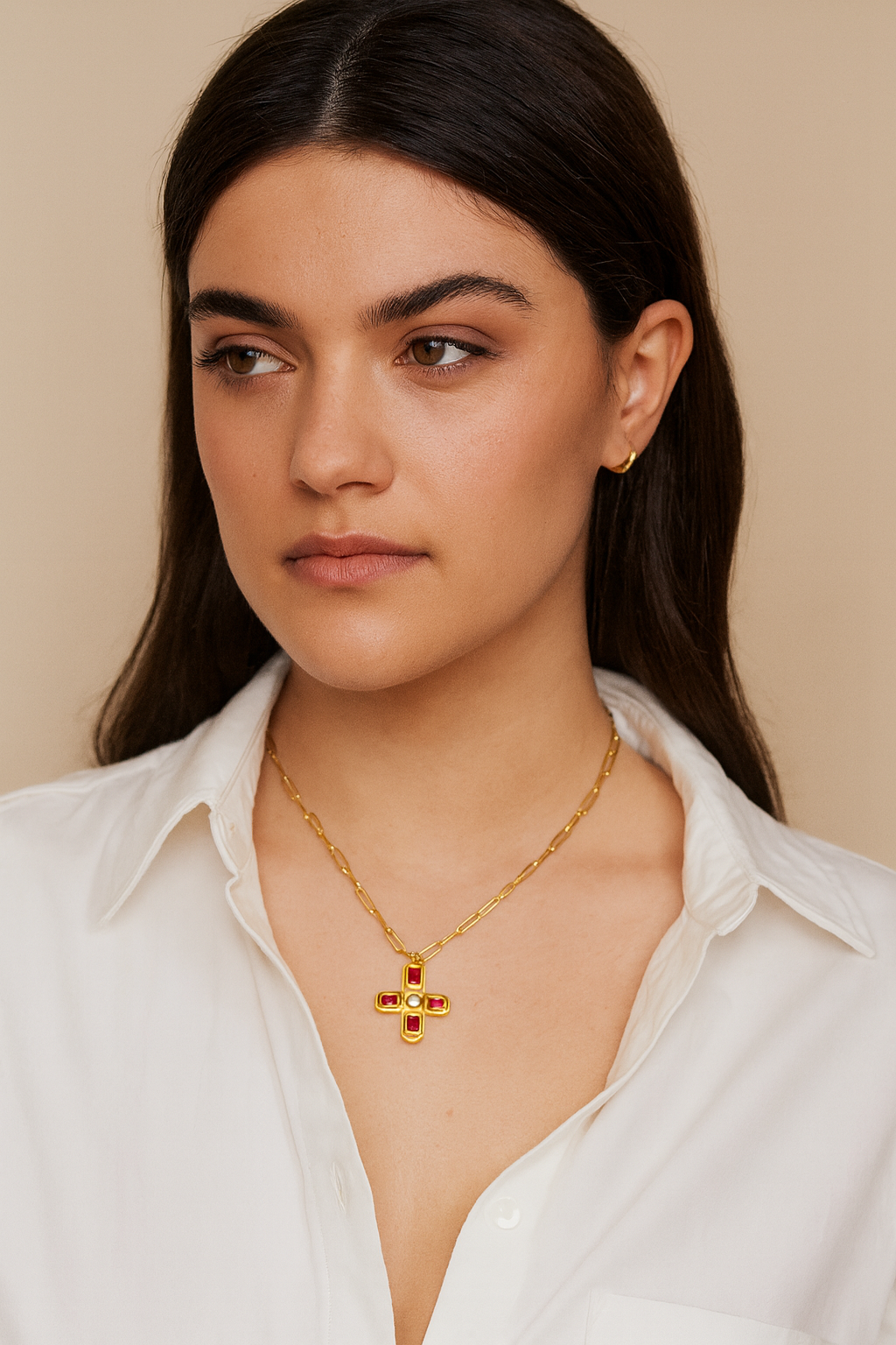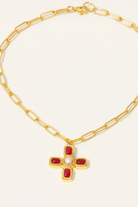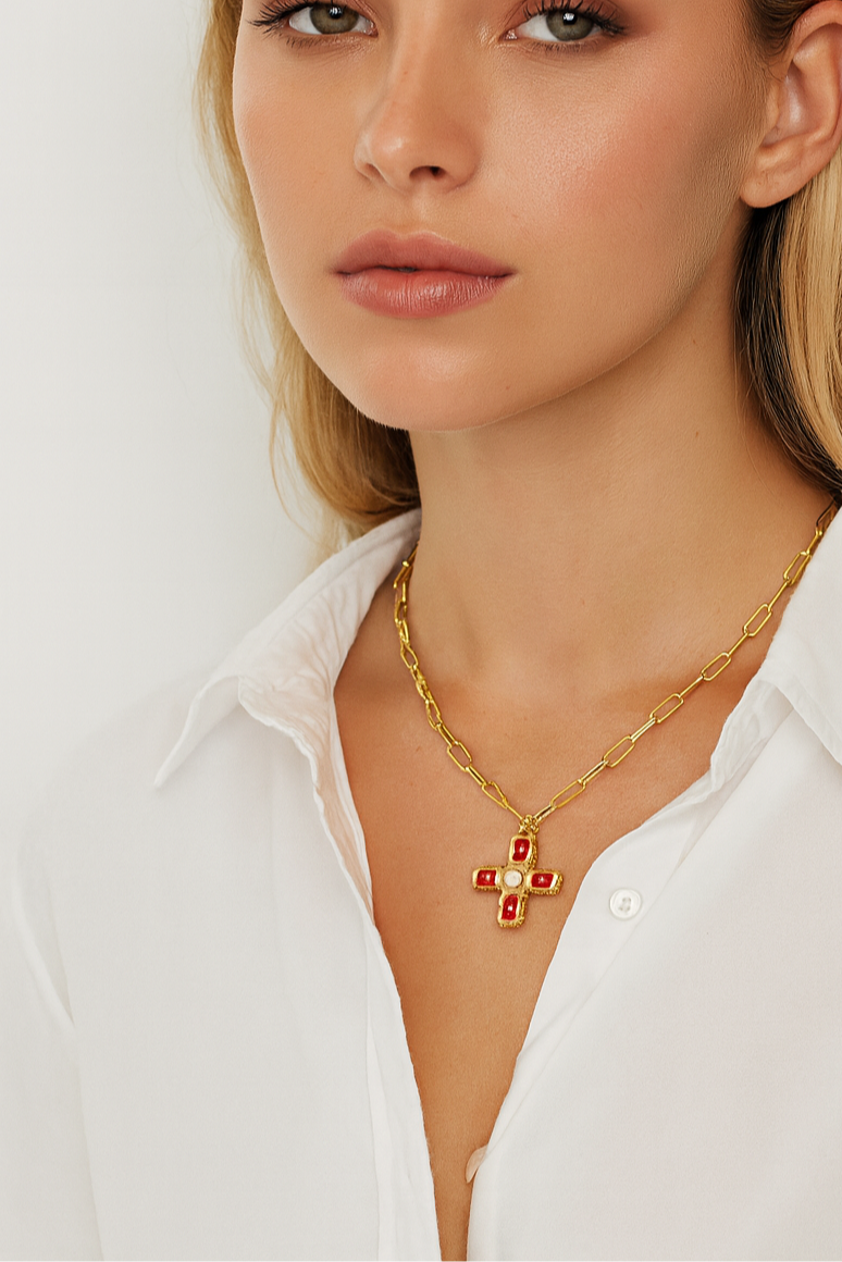 A nod to old-world elegance. This gold chain necklace features a bold cross pendant adorned with ruby-red and pearl-like accents. Designed to layer beautifully or wear solo, it gives a refined vintage glow to any outfit.