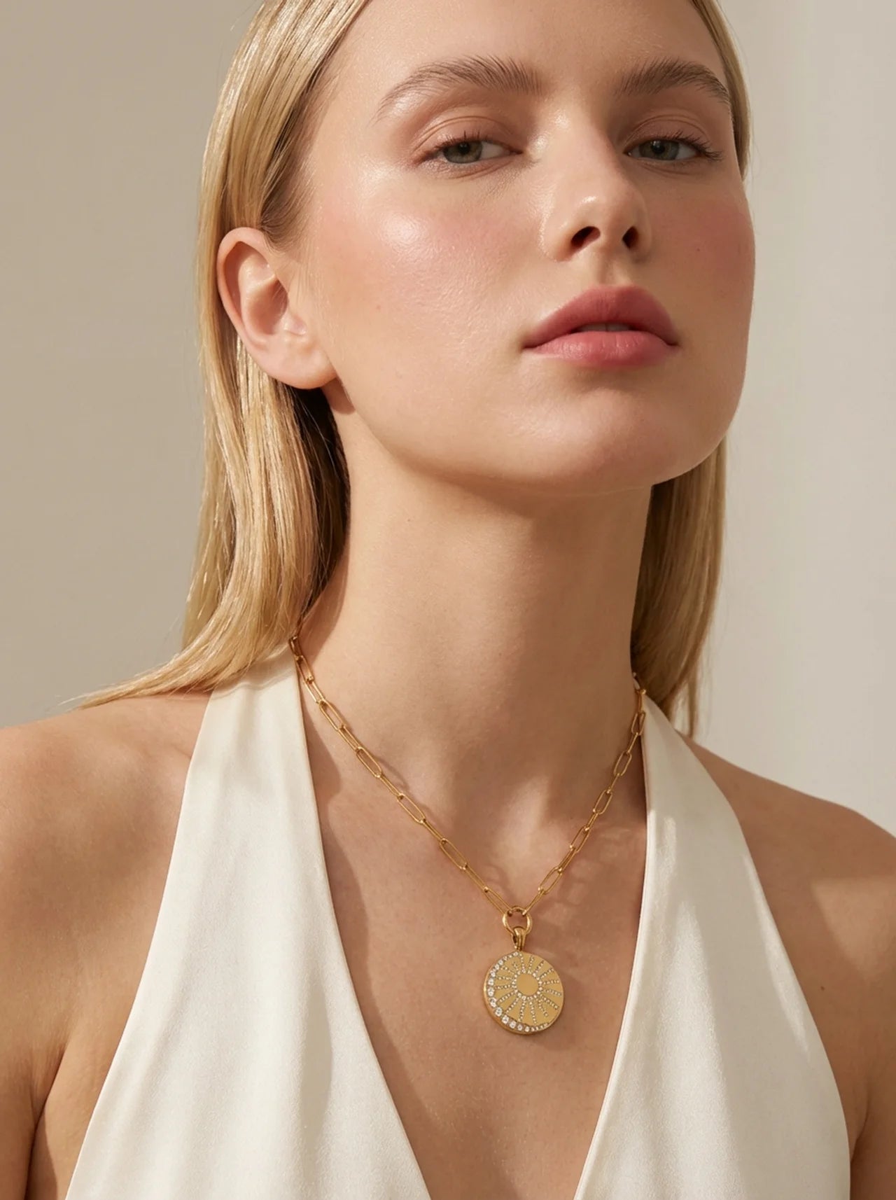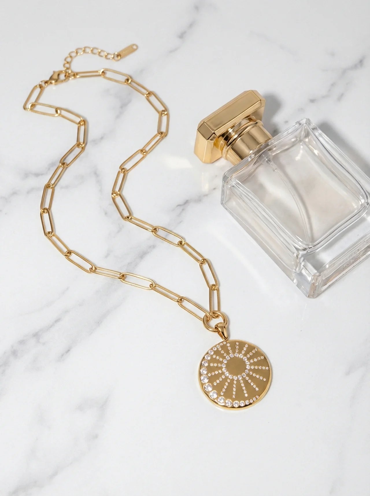 A minimalist moon and sun pendant necklace adorned with full crystal detailing, designed to add celestial elegance and subtle sparkle to any outfit.