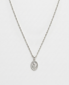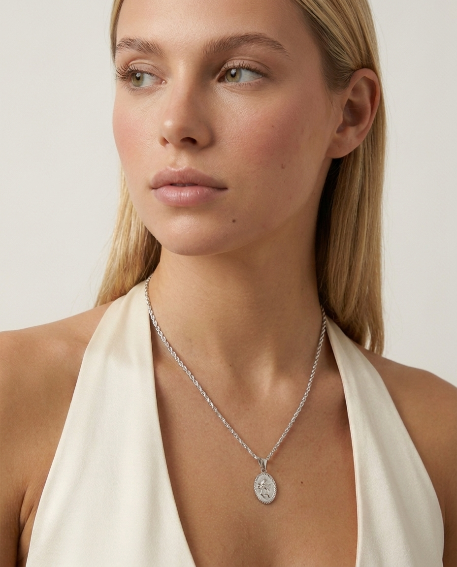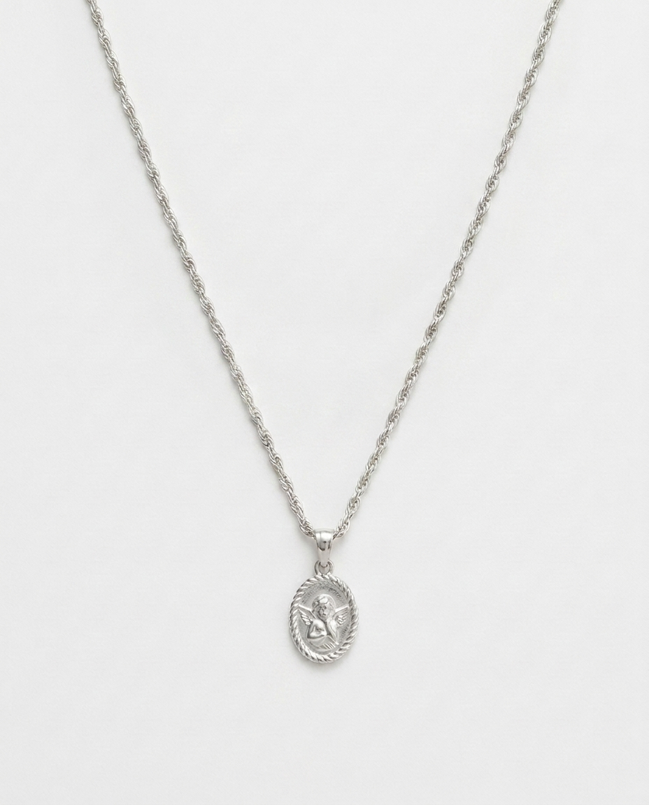 Le médaillon d'ange. Un collier délicat avec un pendentif ovale et un chérubin gravé, suspendu à une fine chaîne en corde torsadée.
